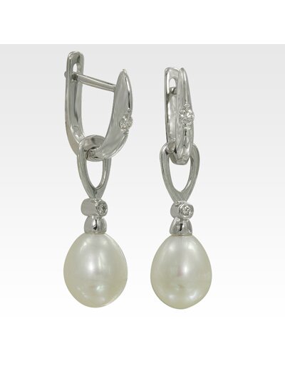 Серьги-трансформер из белого золота с жемчугом и бриллиантами выполнены из высококачественного белого золота 585 пробы, что обеспечивает им долговечность, благородный блеск и гипоаллергенность. Сверкающий белый металл идеально гармонирует с нежным сиянием жемчуга и ослепительным блеском бриллиантов, создавая впечатление чистоты и роскоши. Дизайн изделия представляет собой изящную подвесную конструкцию: к дужке английского замка, гарантирующего надежное крепление, крепится подвижное звено, плавно переходящее в декоративный элемент, увенчанный бриллиантом, который в свою очередь элегантно удерживает жемчужину. Общая длина каждой серьги составляет приблизительно 30 миллиметров, а ширина самой широкой части замка - около 5.5 миллиметров, что придает изделию утонченный, но заметный вид. Центральным элементом композиции являются две великолепные культивированные пресноводные жемчужины. Их форма - классическая "груша" - обладает идеальной симметрией и гладкой поверхностью. Диаметр каждой жемчужины составляет около 9.0-9.5 миллиметров. Жемчуг отличается глубоким, насыщенным кремово-белым оттенком и исключительным перламутровым отливом, который играет на свету, создавая завораживающий мерцающий эффект при каждом движении. Глянцевая поверхность жемчуга отражает свет, добавляя украшению живого, объемного сияния. Блеск жемчуга дополняется сиянием четырех натуральных бриллиантов. На каждой серьге расположены по два бриллианта круглой огранки. Один камень, диаметром около 1.0 миллиметра, искусно инкрустирован в изящную основную часть английского замка, придавая ему дополнительную искру. Второй, более крупный бриллиант, диаметром около 2.0 миллиметров, надежно закреплен в декоративном элементе непосредственно над жемчужиной, подчеркивая ее красоту и добавляя света композиции. Общий суммарный вес всех бриллиантов в паре составляет приблизительно 0.120 карата, с характеристиками цвета 4 и чистоты 5, что гарантирует их превосходное качество, безупречную прозрачность и яркое сияние. Приблизительный общий вес пары серег составляет около 5.3 граммов, что делает их комфортными для ношения на протяжении всего дня, не вызывая ощущения тяжести.