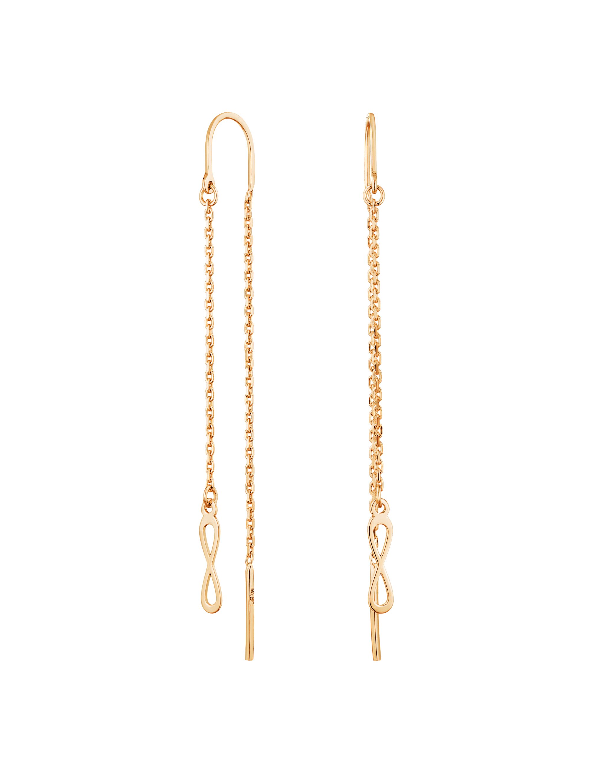 Серьги золотые "Бесконечность" - это утонченные ювелирные изделия, состоящие из тонкой цепочки, проходящей сквозь мочку уха с подвеской в виде горизонтальной восьмерки. Знак бесконечности выполнен из красного золота 585 пробы. Это серьги-протяжки, которые выглядят очень легко, элегантно и притягивают взгляды за счет движения. Подходят как для повседневного ношения, так и для вечерних образов. Серьги-нитки с бесконечностью подчеркивают изящество шеи, добавляют образу шарма и имеют глубокий философский смысл, напоминая о вечных ценностях. Средний вес - 1,17 гр.
