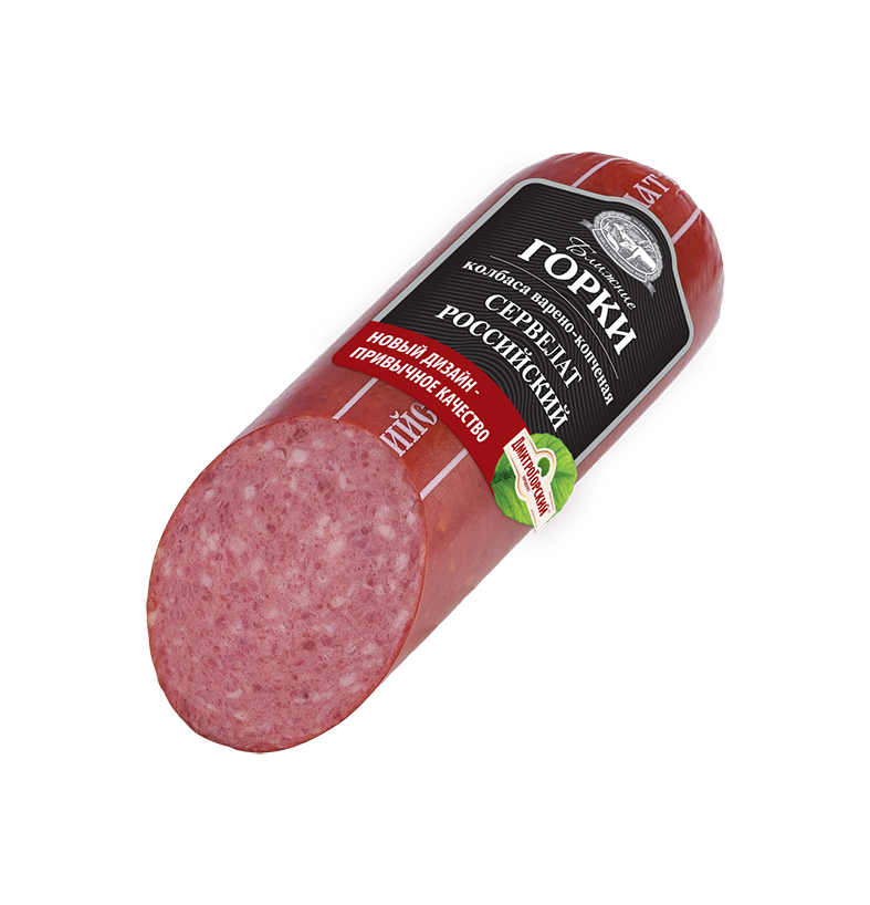Сервелат Росийский - это традиционный варено-копченый сервелат, приготовленный из говядины и свинины с добавлением мускатного ореха и чеснока.