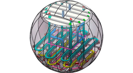 Сферические резервуары предназначены для перемещения, хранения природного газа, кислорода, азота, аргона, нефтепродуктов в сжиженном состоянии, внутри которых поддерживается криогенная температура ниже -153°C. Наряду с горизонтальными, вертикальными цилиндрами, газгольдерами сферические резервуары являются наиболее удобной формой для размещения газа в жидком виде. Стальные полые шары востребованы в нефтегазопереработке, в энергетике, машиностроении, медицине, металлургии, радиоэлектронике, сельском хозяйстве. Конструкция представляет собой шарообразную ёмкость с двойными стенками, между которыми размещается теплоизоляционная экранно-вакуумная или порошково-вакуумная, высоковакуумная прокладка. Материалом изготовления наружного кожуха чаще всего служит низколегированная, углеродистая сталь или алюминиевые сплавы, а внутренний сосуд, непосредственно контактирующий с продуктом, делают из хладостойкой нержавейки. Внешний слой необходим для защиты изоляции, поддержания заданного давления. Шаровые резервуары снабжены предохранительными клапанами, аппаратурой, контролирующей давление, трубопроводной обвязкой, а также лестницами и площадками обслуживания. Технические характеристики данного резервуара: диаметр от 16850 до 21200 миллиметров, объём от 2500 до 5000 м3., расчётное давление от 1,15 до 3, 25 МПа.