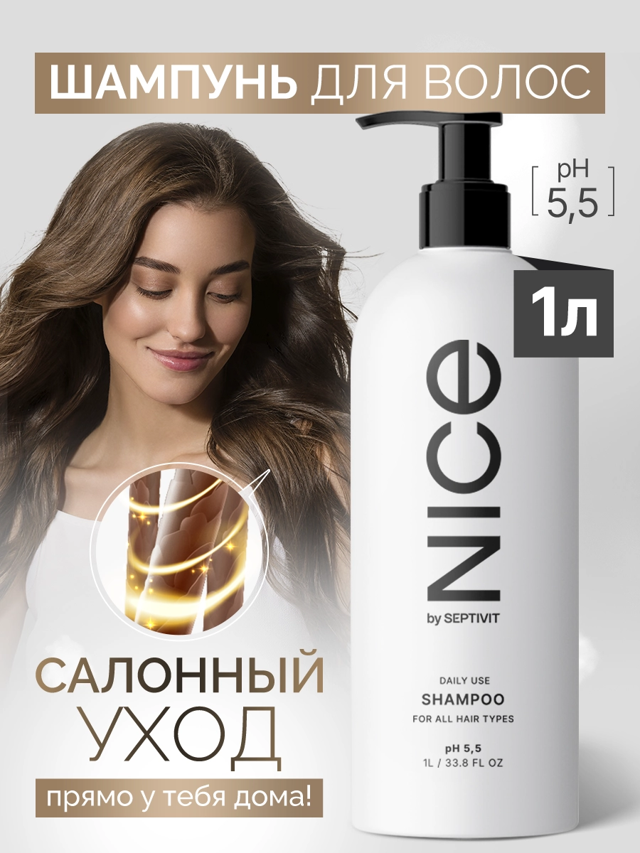 НОВИНКА! Специально разработанная линейка профессионального ухода за волосами от бренда - NICE by Septivit. Шампунь NICE, объемом 1000 мл подходит для ежедневного использования для всех типов волос.