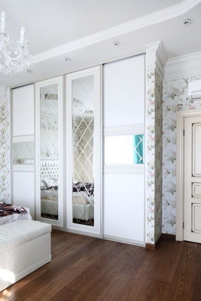 Элегантный четырехстворчатый шкаф идеально дополняет пасторальный интерьер в стиле «Прованс». Идеальным его делают эффектные сочетания текстур и декоров: здесь удачно комбинируются экокожа оттенка «Белый перламутр», которой отделаны фасады боковых створок, и серебряные зеркала, обрамленные широким патинированным молдингом. Узор на зеркалах носит романтичное название «Монастырская решетка». Надежное крепление и мягкое скольжение дверей-купе обеспечивает немецкий профиль белого оттенка