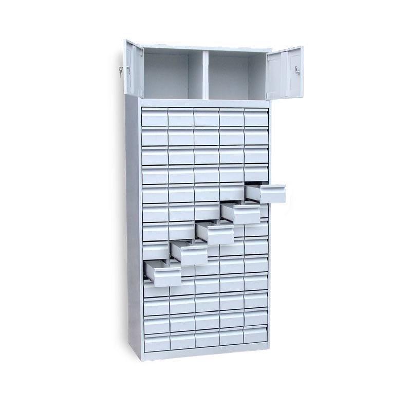 Шкаф картотечный ШК-65 Сварная конструкция. Изготовлен из листового металла толщиной 0,8мм. Антресоль - два отделения с распашными дверями, запираются на замок. Размеры одного отделения антресоли: 330x440x450мм (ВхШхГ) 65 выдвижных ящиков на телескопических направляющих. Внутренние размеры ящиков - 85х115х400мм (ВхШхГ). Покрытие полимерное, светло-серого цвета RAL 7035, доступен в других цветах по таблице RAL. Поставляется в собранном виде. Упакован в стрейчпленку.