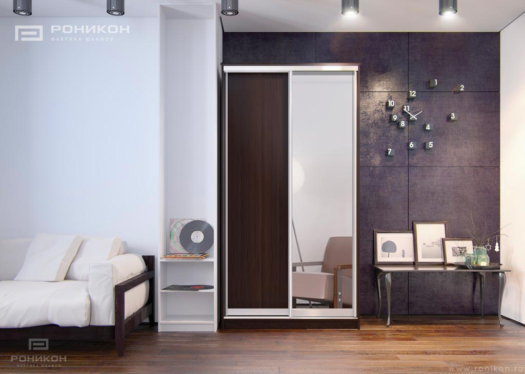 Шкаф-купе имеет стандартную комплектацию: Корпус состоит из ЛДСП 16 мм; Кромка АBS 2 мм на крыше и боках; Фасад – Зеркало серебро и ЛДСП 10 мм; Штанга металлическая, цвет хром; Лента-щетка имеется по одной штуке на каждой двери; Свес крыши 30 мм.