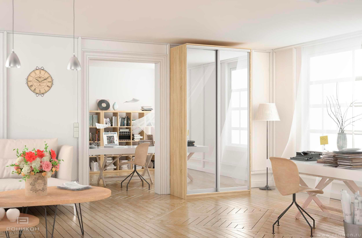 Шкаф-купе имеет стандартную комплектацию: Корпус состоит из ЛДСП 16 мм; Кромка АBS 2 мм на крыше и боках; Фасад – Зеркало серебро; Штанга металлическая, цвет хром; Лента-щетка имеется по одной штуке на каждой двери; Свес крыши 30 мм.