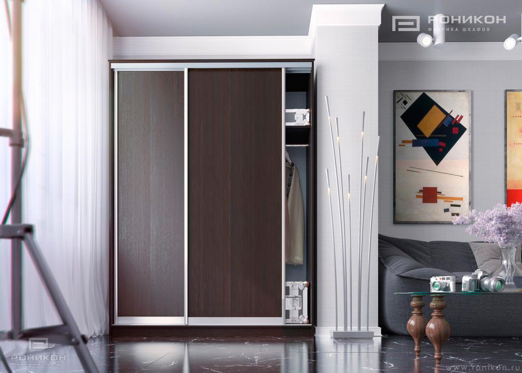 Двухдверный шкаф-купе. Внутреннее наполнение шкафа в цвет корпуса. Нижний цоколь высотой 100 мм. Шкаф Серии Престиж Эко не подходит к старым шкафам серии Престиж. В целях уменьшения цены были сделаны конструктивные изменения. Вся присадка шкафа сделана на видимые крепежи. Для установки шкафа у стены потребуется пространство один метр сорок сантиметров. Двери купе из алюминиевого профиля анодированного в цвет серебро с нижним опорным роликом.