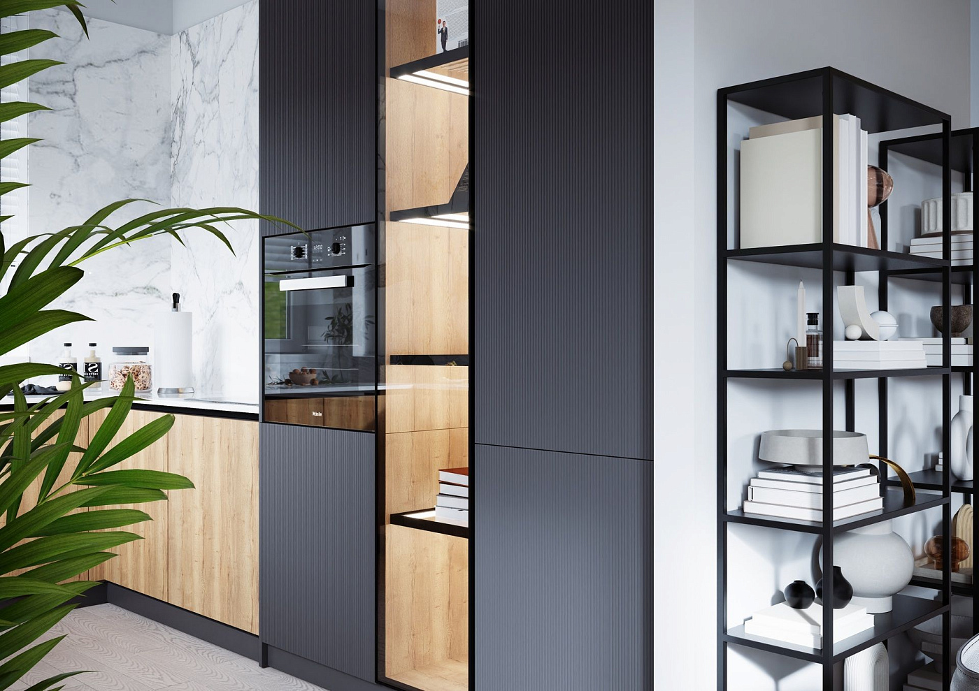 Шкаф распашной RIFA – часть единого проекта интерьера коттеджа. Рифленый фасад RIFA – это не только фасад шкафа для кухни, но и двери-купе шкафа в прихожую, тумбы в прихожую и в гостиную. Баланс в интерьере достигается именно за счёт повторяющегося элемента в дизайне мебели. При этом, ограничивая тёмные оттенки естественными природными цветами, мы визуально расширяем пространство. В данном проекте: Корпусный шкаф RIFA, распашные двери МДФ, матовая эмаль «Basalt grey» и шкаф в профиле Edge черного цвета, со стеклянными распашными фасадами и стеклянными полками с подсветкой. Фасады для кухни серии JUST в цвете «Дуб Галифакс натуральный» с фактурной древесной поверхностью. Для отделки фасадов RIFA используется акриловая эмаль с матовым, суперматовым или глянцевым покрытием, есть также широкий выбор цветов в покрытии 3D-экопластик. Цвет и рисунок полотна для двери с фрезеровкой, Вы можете выбрать по представленным в салонах ARISTO образцам и каталогам. Каталог коллекции дверей с фрезеровкой KLAVIR можно посмотреть здесь. Помещение в спальню, в гостиную, в кухню Тип конструкции корпусный Стиль современный Материал Панели МДФ, стекло Цвет дерево, синий Модули напольные Корпус ЛДСП