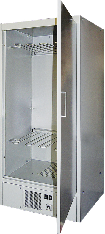 Магнитная защелка, две съемные полки. Тепловентилятор расположен в нижней части шкафа, закрыт защитным кожухом. В днище шкафа предусмотрен слив для излишков воды. В крыше шкафа имеется перфорированное вентиляционное отверстие, с монтажными отверстиями для установки фланца для вентиляции.