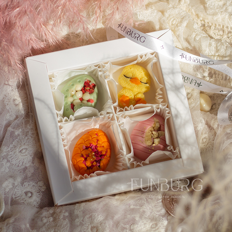 Маленький набор шоколадных конфет ручной работы в форме очаровательного цыплёнка и расписных яиц из белого, клубничного, апельсинового и лимонного шоколада с добавлением разноцветных рисовых шариков, сублимированных клубники, малины и банана идеально подойдут для небольшого подарка на Пасху!