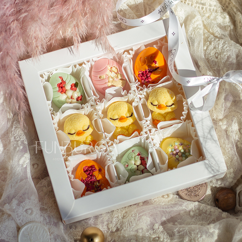 Красивый весенний набор вкуснейших шоколадных конфет ручной работы в форме очаровательных цыплят и расписных яиц из белого, клубничного, апельсинового и лимонного шоколада с добавлением разноцветных рисовых шариков, сублимированных клубники, малины и банана идеально подойдут для подарка на Пасху!