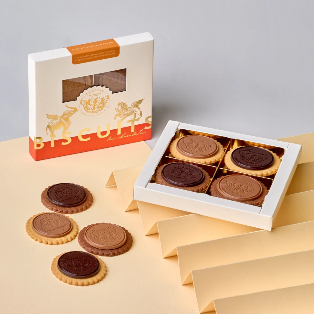 Набор шоколадно-миндального печенья с молочным и горьким шоколадом от конфетной фабрики «Счастье».