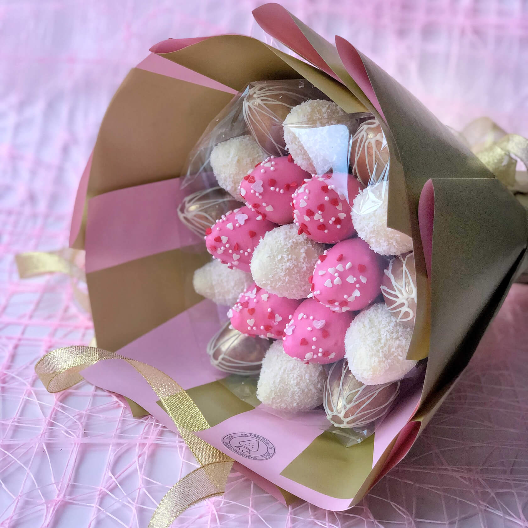 Ягоды декорированы сахарными сердечками, мягкими жемчужинами, кокосовой стружкой, пищевым золотом и шоколадными узорами.