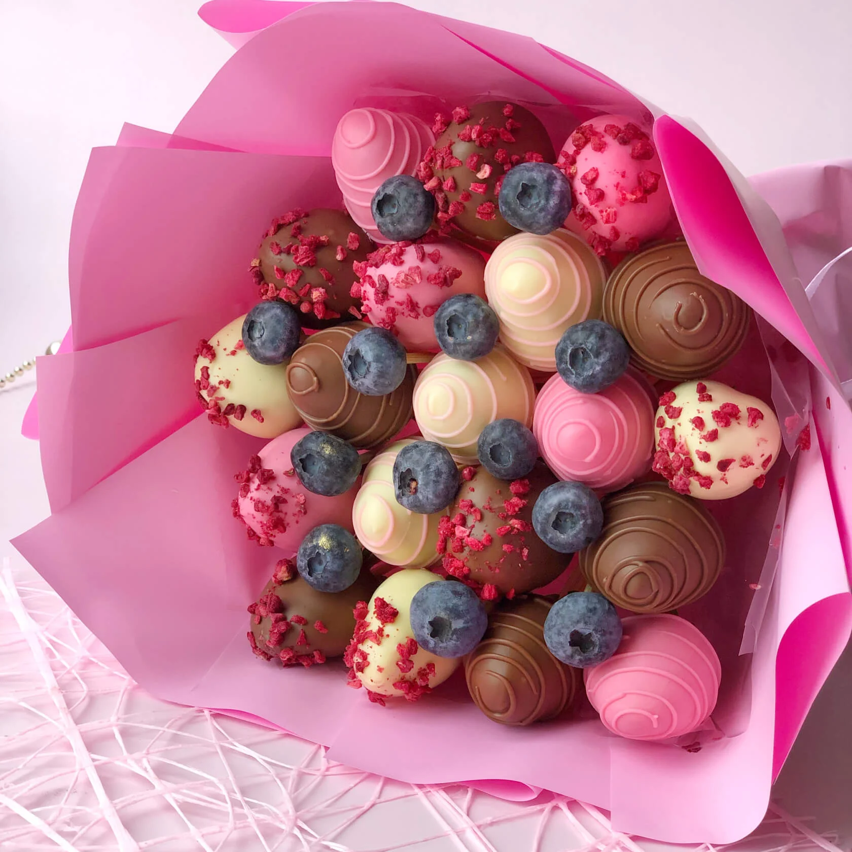 Ягоды декорированы сублимированной малиной, свежей голубикой и шоколадными узорами.