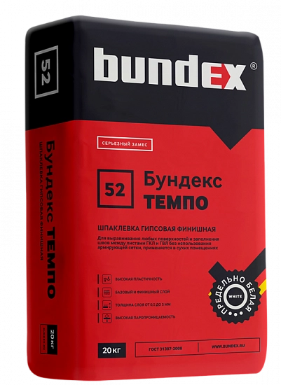 Шпаклевка Бундекс Темпо - это шпатлевка гипсовая финишная на основе гипсового вяжущего, тонкомолотого мраморного заполнителя и специальных функциональных добавок. Используется для выравнивания любых поверхностей и заполнения швов между листами ГКЛ и ГВЛ без использования армирующей сетки. Универсальность, удобство нанесения, исключительная жизнеспособность на основании и быстрый набор прочности сокращает сроки выполнения работ. После отверждения материала образуется прочный паропроницаемый слой, пригодный для эксплуатации внутри отапливаемых помещений с нормальной влажностью..Цвет - белая. Максимальная крупность заполнителя - 0,2 мм. Расход смеси при слое 1 мм - 0,9-1,05 кг/м2. Температурные условия при эксплуатации -от +5.до+40°С.