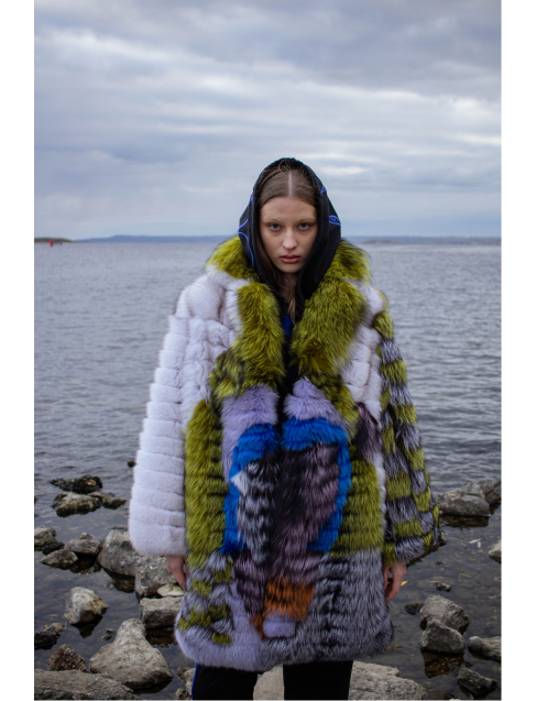 Шуба из песца и лисицы - это объемная шуба из натурального меха. Шуба силуэта трапеция, с объемным комбинированным воротником из песца светлого оттенка и крашенной лисицы с/ч, рукава также комбинированные. На передней части расположен авторский принт, посередине установлены застежки крючки, 2 кармана, сзади изделие выполнено полностью из песца светлого оттенка, спущенный рукав. Состав - 100% натуральный мех норки. Подкладка - 60% вискоза, 40% полиэстер.
