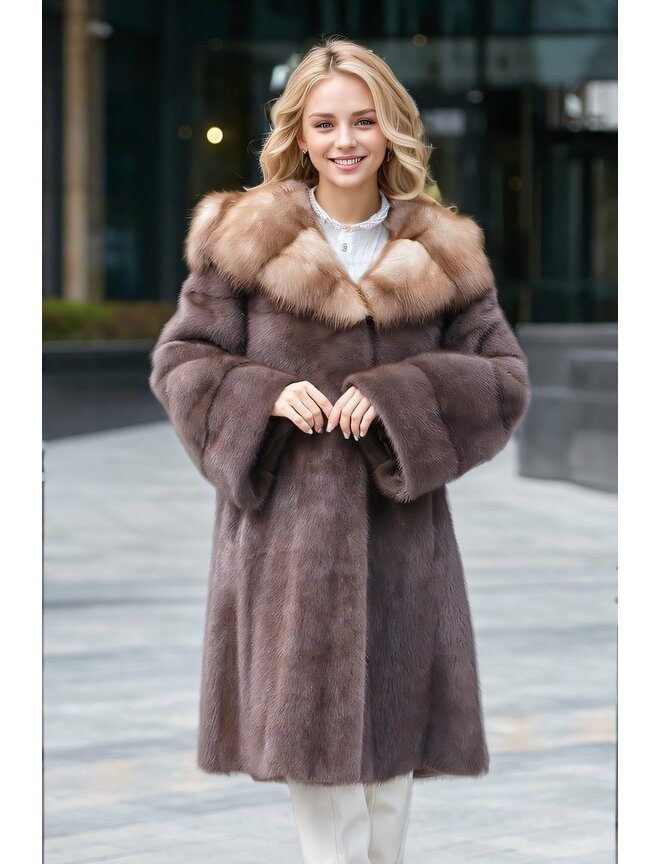 Шуба норковая "Диана" - это шубка летящего силуэта, с активными фалдами на спинке и полочке. Расклешение от области лопаток придаст образу легкость и изящество. Очень удобная и комфортная посадка не сковывает движения и позволяет скрыть некоторые особенности фигуры. Расклешенный рукав и кокетка выложены из поперечных пластин цельных шкурок норки. Юбка данного изделия выложена из шкурок "вдоль". Застежка на шубные крючки. Данную модель изготавливается с большим объёмным и удобным капюшоном, с отделкой из каменной куницы.Длна - 100см.