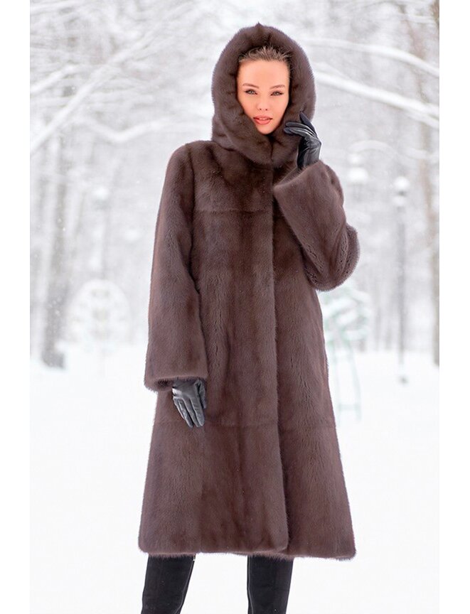 Шуба норковая Классика - это шубка А-образного силуэта из цельных пластин меха норки. Сидит достаточно свободно за счет небольшого расклешения и удобного рукава с низкой проймой. Есть объёмный и удобный капюшон с возможностью застегнуть его и обеспечить более плотное прилегание. Великолепный природный окрас шоколадного цвета с дымчато-голубой подпушью. Мех плотный, мягкий и шелковистый на ощупь, средней высоты. Данная модель может быть выполнена в любом цвете норки, любой длине и с различными вариантами отделки воротника или капюшона. Длина - 110 см.