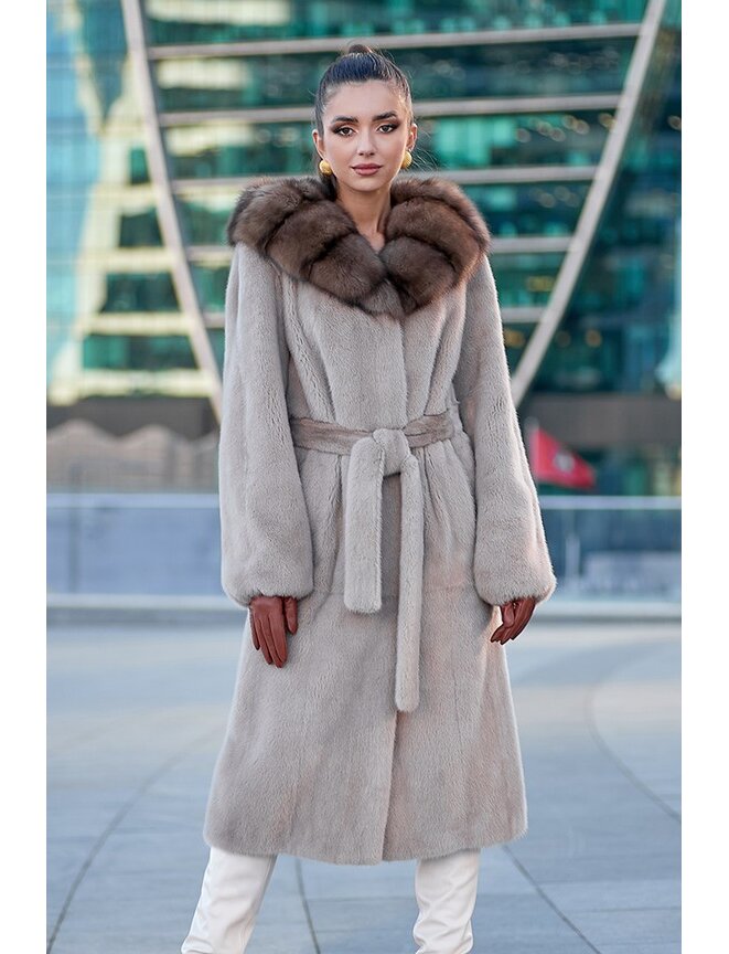 Шуба норковая "Татьяна" хорошо садится на любую фигуру. Объёмный и удобный капюшон отделан баргузинским соболем. Мех красивого бледно-бежевого цвета "сахара". Удобство и современный вид данной модели придает спущенная пройма, что позволит одевать любую одежду под низ шубки и чувствовать себя комфортно. Силуэт у изделия прямой, без реза в области талии. Можно носить как с поясом, так и без.