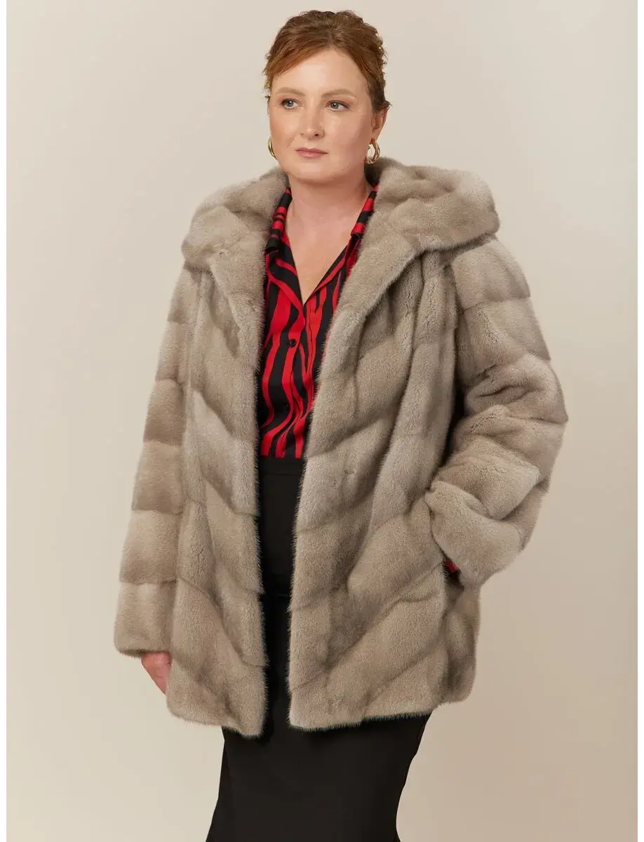 Шубы из Норки "София" - это современное меховое изделие), предназначенное для создания элегантного образа, защиты от холода и ветра в зимний период. Оттенок норки серо-голубой, цвет натуральный, некрашеный, мездра белая. Короткая модная модель, длина по спинке 75см, рукав 64-65см идеально для автоледи. Рукав спущенный. Теплый стильный меховой капюшон согреет в зимние морозы. Капюшон небольшой, без пуговицы, на крючке, застёгивается плотно. Диагональная выкладка шкурок ПАРКЕТ норок современна и оригинальна. Шкурки блестящие, пушистые и нежные на ощупь. Шкурки скандинавской селекции, цвет натуральный. На рукавах утяжки, по низу тоже утяжки. Кармашки бархатные внутри.