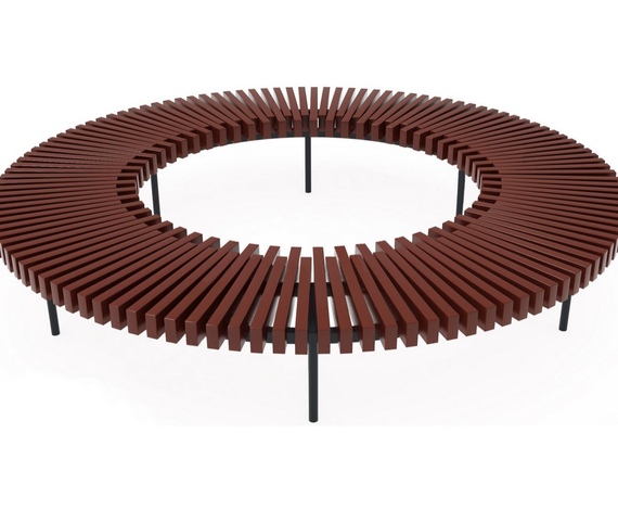 Скамья круглая станет стильным дополнением парковой зоны, детской площадки и другой зоны отдыха. Для изготовления каркаса круглой скамьи используют профиль 40х25 мм, а также круглые трубы радиусом 16 мм. Элементы соединены методом сварки, после чего сварные швы тщательно отшлифованы. После этого, каркас покрывают порошковой краской. На выступающих концах профиля устанавливают пластиковые заглушки. Детали сиденья состоят из шлифованной доски 40х100 мм. Дерево покрывают грунтом акриловым, после чего наносят двухкомпонентную полиуретановую краску.