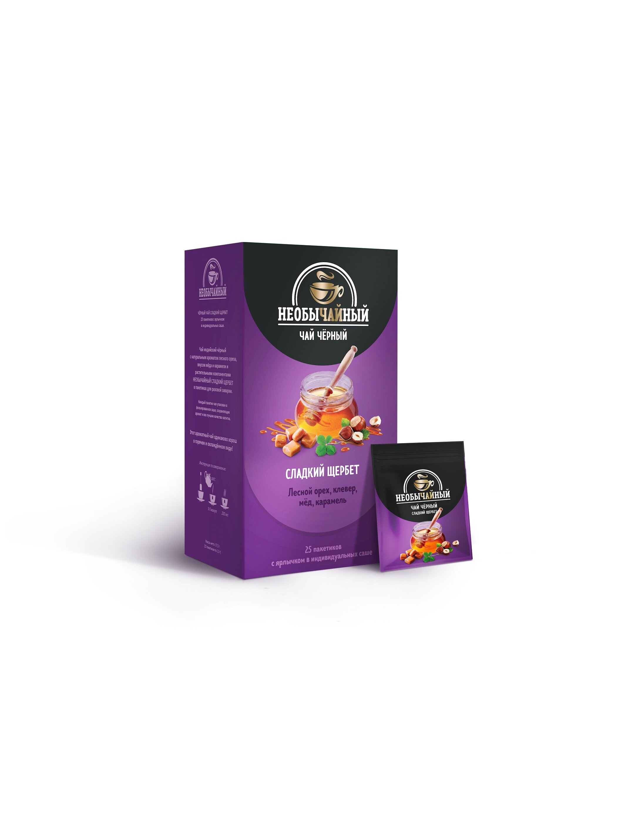 Состав: Чай индийский черный, лист клевера, ароматизатор «Сладкий щербет».