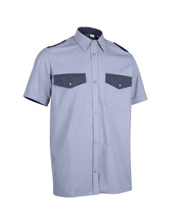 Сорочка охранника короткий рукав, цвет – серо - голубой рекомендуется для сотрудников организаций, занимающихся охранной деятельностью.Рубашка с центральной застежкой на пуговицы, нагрудными накладными карманами с фигуными клапанами на пуговицах. Воротник отложной на отрезной стойке. Погоны с фиксацией на пуговицу. Клапаны, погоны, внутренняя стойка воротника выполнены из черной ткани ГОСТ 19867-93