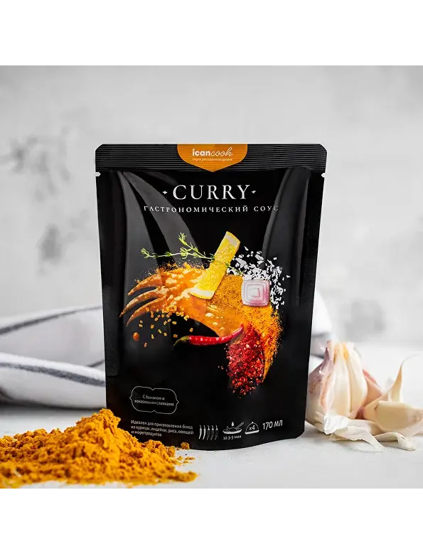 Состав: Вода питьевая, пюре яблочное, банановое пюре, сок апельсиновый концентрированный, пюре морковное, молоко кокосовое, специи карри (куркума, кориандр, имбирь, шамбала, кумин, перец красный чили, соль пищевая, фенхель, горчица, гвоздика), сок яблочный концентрированный, луковое пюре, соль пищевая, уксус яблочный, крахмал гороховый, паста карри (лук-шалот, чеснок, красный перец чили сушеный, соль, лемонграсс, каффир-лайм, галангал, корица, мускатный орех, тмин, кориандр, куркума), чеснок, кинза, регулятор кислотности — лимонная кислота.