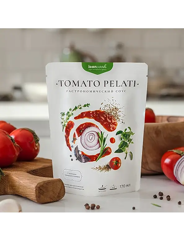 Состав: Томаты пелати, томаты протертые, вода питьевая, луковое пюре, сок овощной концентрированный (сок из моркови, сок из лука, сок из томатов), сок яблочный концентрированный, уксус яблочный, соль пищевая, крахмал гороховый, чеснок, петрушка, сельдерей, базилик, майоран, орегано, розмарин, тимьян, перец черный.