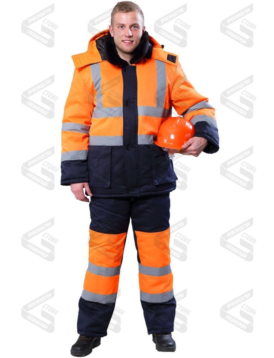 Спецодежда КОС 402.0.1/402 зимний рабочий костюм светоотражающий ГОСТ: 12.4.303-2016 / 12.4.281-2014 Куртка утеплённая прямого силуэта с центральной застежкой на тесьму-молнию и планкой. Воротник отложной, меховой. Съемный капюшон. Нижние объемные накладные карманы с клапанами, один внутренний накладной карман. Рукава втачные, с трикотажными манжетами. По линии талии – кулиса. СОП 50 мм: проходит по швам стачивания верхних и нижних частей: полочек, спинки и рукавов. Также СОП проходит через плечи, соединяясь с верхней полосой на полочках и спинке. Брюки утеплённые с притачным утеплённым расширенным поясом, с застёжкой гульфика пуговицы, с бретелями. На передних половинках расположены боковые накладные карманы с клапанами. По линии колен выполнены наколенники из контрастной ткани с двумя рядами СОП 50 мм.