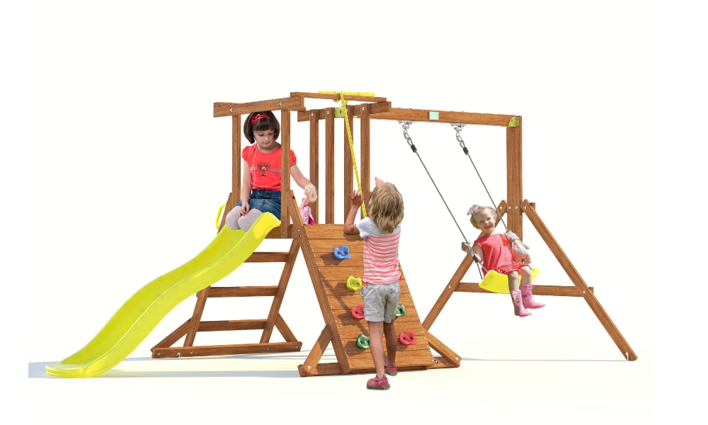 Спортивно-игровые комплексы SUNRAY идут со скалодромом, горкой и качелями, и отлично подходят для организации детского досуга на свежем воздухе. Комплектация данного комплекса включает в себя: пластиковую горку - 1,75 м желтого цвета, качели - 1 шт., детский телескоп, скалодром с канатом и пятью пластиковыми упорами для рук и ног, деревянную лестницу с удобными поручнями, руководство по сборке. Размеры - 3600*2300*1750 мм, вес 60 кг. Высота платформы форта - 900 мм. Размер платформы форта - 640*1000 мм. Длина ската горки - 1750 мм. Занимаемая площадь - 10 м2.