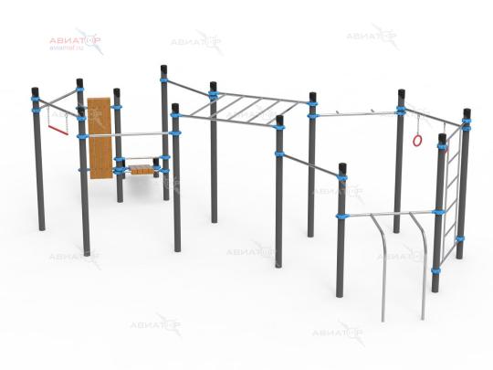 Спортивный комплекс помогает развивать ловкость, силу хвата, прорабатывать все группы мышц. Оптимальное сочетание разных элементов обеспечивает эффективные физические нагрузки. Изделие устанавливается в заранее подготовленные отверстия глубиной - 0,6 м и заливается бетоном. Поставляется в разобранном и упакованном виде. Длина - 7,5 м. Ширина - 4,85 м. Высота - 2,5 м.