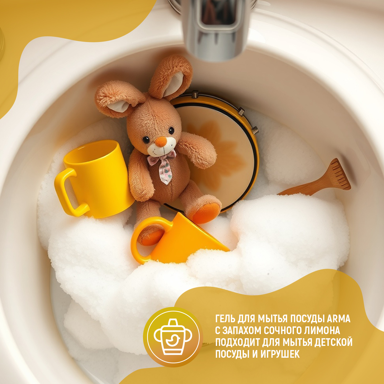 Средство для мытья посуды АРМА 5000 мл с запахом сочного лимона подходит для мытья всех видов кухонных принадлежностей и детских игрушек. Это безопасное экологичное средство, которое позволяет легко и быстро очищать любые поверхности от загрязнений. Благодаря эффективной формуле образуется плотная пена, которая легко удаляет жир и остатки пищи с любого типа посуды как в горячей, так и в холодной воде. Нейтрализует неприятные запахи и дарит освежающий цитрусовый аромат на кухне. В составе отсутствуют агрессивные и опасные для здоровья компоненты, что подтверждено ЭКО сертификатом. Гель полностью смывается водой. Жидкое гипоаллергенное универсальное и натуральное средство не сушит, а нежно ухаживает за кожей рук. Не подходит для посудомоечных машин. Продукт изготовлен компанией Бергус.