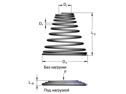 Помимо указанных выше характеристик («Пружины сжатия»), конические пружины имеют одно явное технологическое различие. Из-за конической формы витки пружины заходят один в другой при ее полном сжатии. Такие изделия используются при ограниченном месте вдоль оси.