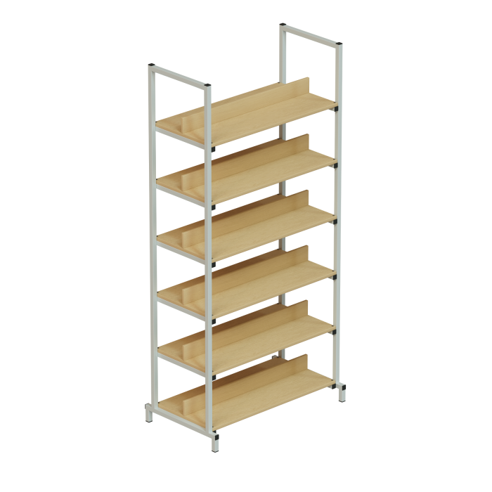 Стеллаж двухсторонний на металлокаркасе с горизонтальными полками