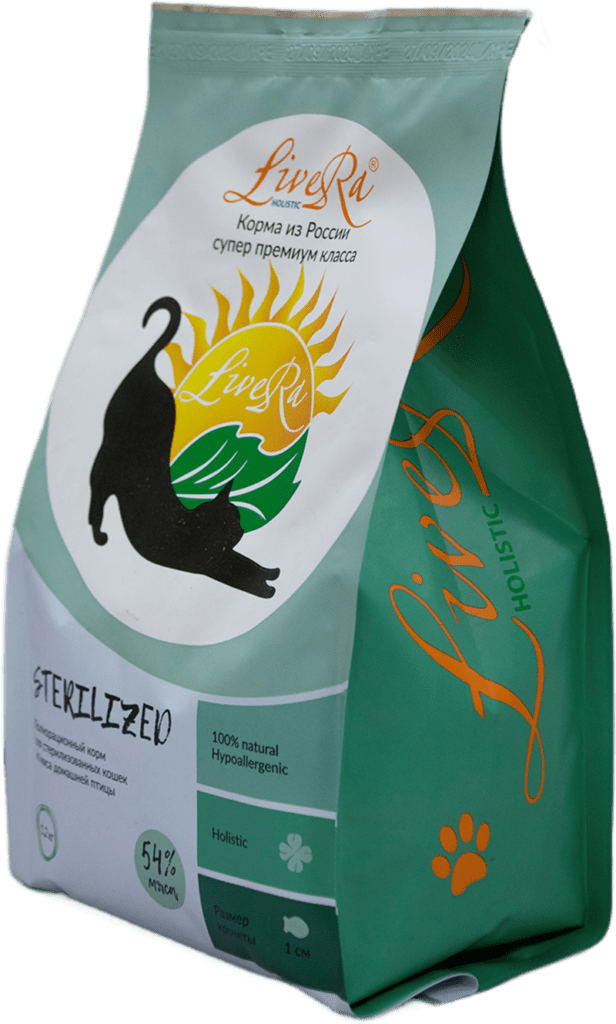 LiveRa STERILIZED (нежное мясо индейки для гурманов) 54% мяса — легкоусваиваемый, полноценный рацион профессионального питания для стерилизованных кошек,, который создан специально для поддержания здоровья кошек, основанный на натуральных компонентах с добавлением необходимых витаминов и минералов. Сбор трав входящий в состав корма улучшает работу желудочно- кишечного тракта, поддерживает иммунитет ,способствует улучшению качества шерсти и состоянию кожи. Содержит большое количество таурина для хорошего зрения и здорового сердца. Содержит источники натуральной клетчатки для выведения волосяных комочков из пищеварительного тракта. Корм STERILIZED — это комплекс , чтобы животное оставалось здоровым, активными, игривыми, наслаждаясь полной жизнью и даря Вам радость.
