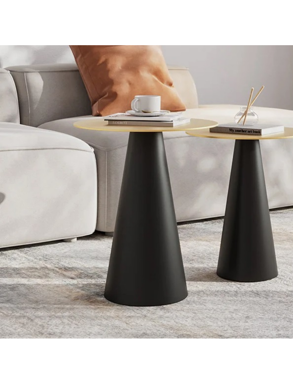 Основание формой усеченного конуса обшито чехлом из эко кожи. Столешница может быть выполнена из матового инновационного материала FENIX NTM, МДФ шпонированного дубом или ясенем, hpl' или керамогранита. Цена за стол в размере 49 х 49 см.