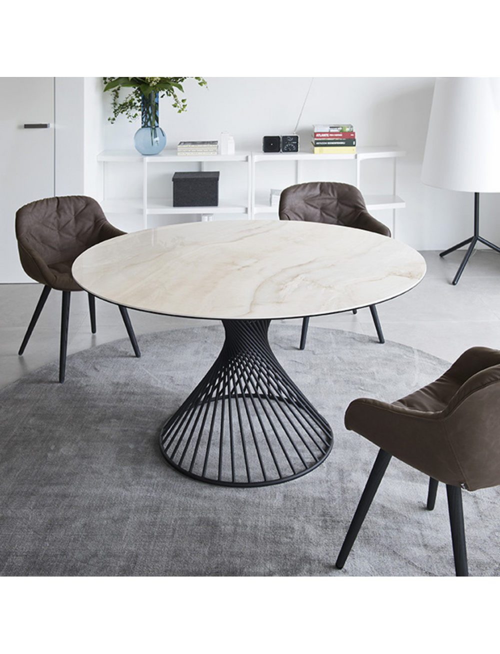 Основание стола выполнено из цельногнутого массива берёзы облицованное полимерными материалами и микро цементом. Текстура создаётся мастерами вручную. Доступны в круглом и овальном исполнении Цена за стол в размере 120 х 120 см.