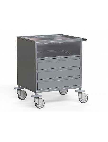 Стол медицинский для анестезиолога БТ-СТНА-100 - это удобное многофункциональное изделие из нержавеющей стали, имеющее три выдвижных ящика и специальную открытую нишу. Стол может применяться практически в любых медицинских организациях: в больницах и поликлиниках, санаториях, помещениях для стерилизации, в процедурных или операционных. Стол анестезиолога предназначен для того, чтобы разместить медицинский инструмент, лекарственные препараты, расходные материалы при выполнении хирургических операций, медосмотров и прочих манипуляций. Для облегчения перемещения столик оснащен 4 самоориентирующимися колесами. Каждое из них имеет диаметр 125 мм и дополнительно оборудовано резиновой шиной. Габариты стола составляют - 760*560*820 мм (без учета бамперов), столешницы - 650*560 мм.