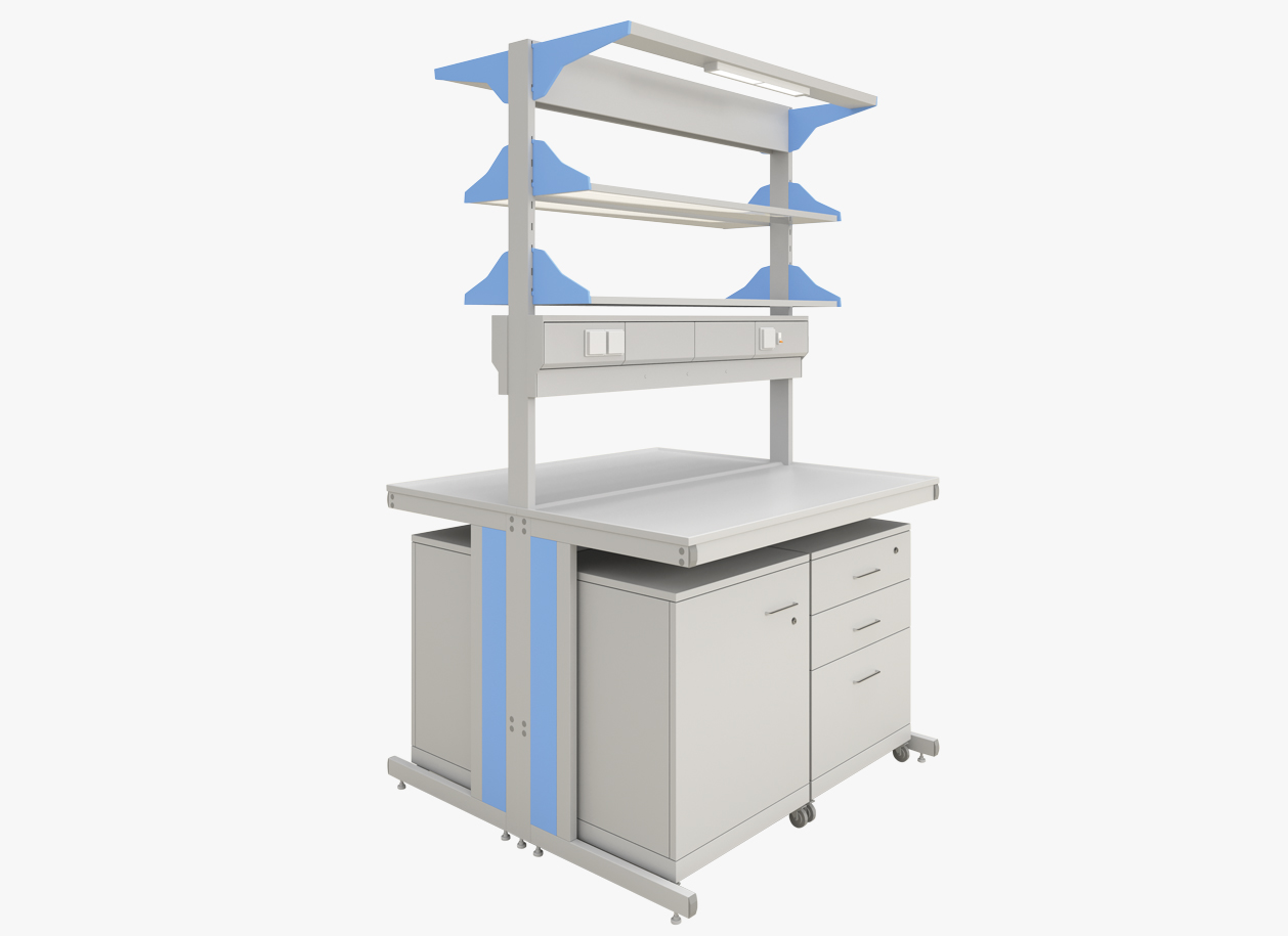 Столы островные физические незаменимы для проведения приборных испытаний. Конструкция представляет собой блок из двух столов, соединенных сервисной стойкой, на которой расположены двухуровневые полки, электрический блок и светильники дополнительного освещения. Островной физический стол позволит удобно и безопасно организовать рабочее пространство и станет основой вашей лаборатории.