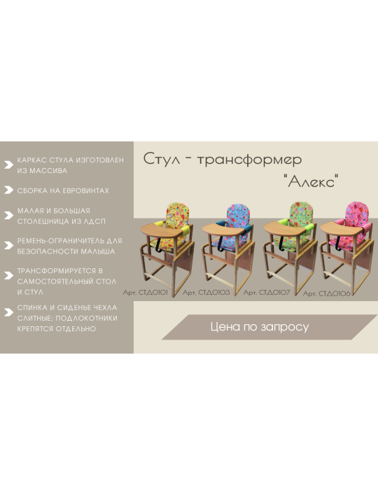 Конструкция стульчика позволяет с легкостью переводить его из позиции «стул для кормления» в самостоятельный стульчик и стол, прекрасно подходящие для развивающих игр и рисования, что позволяет увеличить срок эксплуатации. Стульчик оснащен регулируемым ремнем безопасности, надежно фиксирующим вашего ребенка в конструкции стула. Основная часть ремешка, соприкасающаяся с телом, изготовлена из мягкого материала, который точно не вызовет дискомфорта для малыша, что является преимуществом в сравнении с конкурирующими моделями. Дизайн и цветовое решение стульчиков с легкостью вписываются в интерьер как современной квартиры, так и уютного загородного дома, не создавая при этом визуальный шум. В карточке указана базовая цена, при оформлении заказа предоставляются скидки на следующих условиях: Новым клиентам скидка на развитие до 5% (расчитывается при наличии заказа) Персональная скидка от менеджера до 5% (расчитывается при наличии заказа) Дополнительные скидки до 13% (даются, исходя из различных параметров) Общая возможная скидка от базового прайс-листа до 23%