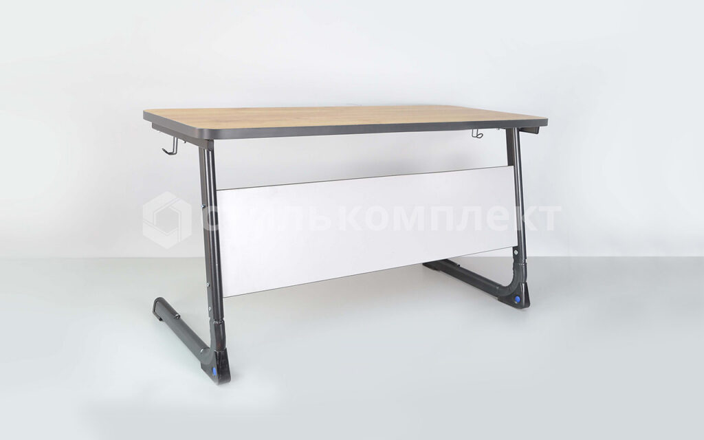 Стол состоит из каркаса, столешницы и экрана. Каркас стола имеет L-образную форму и выполнен из цельногнутой П-образной плоскоовальной трубы двух типов, сечением 50*30 и 45*25 толщиной стенки 1,5 мм. Опорные концы труб закрыты полимерными заглушками-протекторами. Для обеспечения травмобезопасности все углы каркаса скруглены, торцы закрыты пластиковыми заглушками. Нижняя часть опоры оснащена пластиковым треугольным подпятником. С каждой стороны предусмотрены крючки. Механизм регулировки телескопического типа. Металлокаркас окрашен износостойкой полимерной краской методом порошкового напыления. Столешница и экран изготовлены из ЛДСП толщиной 22 мм, кромка ПВХ — толщиной 2 мм. Столешница с закруглёнными углами. Каркас стола выполнен из прочной, цельногнутой П-образной плоскоовальной трубы двух типов сечением 50×30 и 45×25 мм, толщиной стенки 1,5 мм. Особенности конструкции: L-образная форма обеспечивает устойчивость и оптимальное распределение нагрузки; Все углы скруглены, торцы закрыты пластиковыми заглушками — для повышения травмобезопасности; Опоры закрыты полимерными заглушками-протекторами, снижающими износ напольного покрытия; Внизу установлены треугольные пластиковые подпятники; С каждой стороны имеются удобные крючки для рюкзаков или сумок. Каркас окрашен по технологии порошкового напыления износостойкой полимерной краской, устойчивой к механическим повреждениям и коррозии.