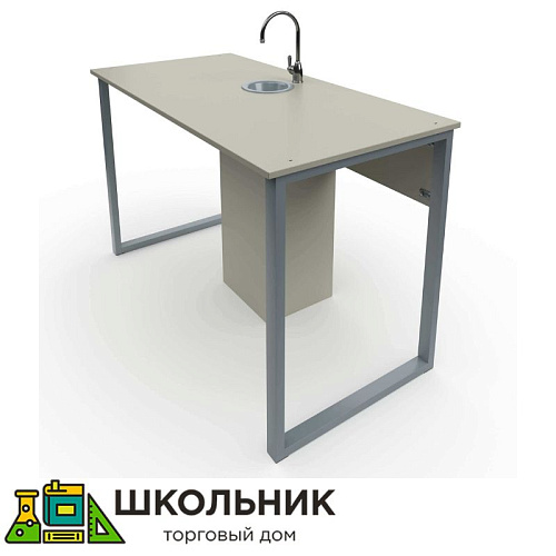 Стол ученический лабораторный, регулируемый по высоте (с защитным, химостойким и термостойким покрытием, раковиной, бортиком по наружному краю, подводкой и отведением воды и сантехникой) / Стол ученический, регулируемый по высоте (приобретается только при наличии специального лабораторного островного стола) Артикул 000-4436; Кабинеты Химия; Стол ученический двухместный с бортиками для кабинета химии с тумбой под сантехнику изготавливается на металлическом каркасе прямоугольного сечения, окрашенном порошковой краской, стойкой к химическим и механическим воздействиям, на свободных концах труб установлены заглушки из ударопрочных полимеров. Столешница выполнена из ДСП 16 мм, облицована стойким к химическим воздействиям пластиком, торцы обрамлены кромкой ПВХ 2 мм. Крепление металлической основы со столешницей осуществляется методом скрытого крепления, без выступающих на рабочей поверхности болтов. Тумба под сантехнику выполнена из ламинированной ДСП 16 мм. Стол оборудован водоразборной колонкой и сливной раковиной. Имеется два крючка для портфелей. Каркас стола имеет полимерные подпятники, предотвращающие повреждение напольных покрытий. (ШхГхВ) 1200х600х760 Цвет ЛДСП , пластика, кромки, металлокаркаса - серый .