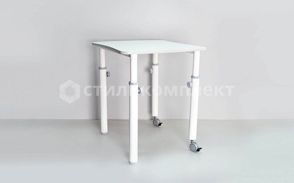 Стол состоит из каркаса и столешницы. Металлокаркас цельносварной с регулируемыми опорами. Опоры изготавливаются из труб круглого сечения ø40 мм и ø51 мм толщиной стенок 1,5 мм. Трубы ø40 мм приваривается к раме из трубы прямоугольного сечения 25х25 мм, толщина стенки 1,5 мм. Механизм регулировки высоты телескопического типа на три фиксированных уровня. В две опоры устанавливаются колеса со стопорами (диаметр ø60 мм). В две другие устанавливаются пластиковые заглушки с регулировкой компенсации неровностей пола. Металлокаркас окрашен полимерной краской методом порошкового напыления. Столешница изготавливается из ЛДСП толщиной 16 мм, кромка ПВХ толщиной 1 мм. Габариты столешницы 668 мм в длину и 580 мм в глубину, радиус закруглений 50 мм.