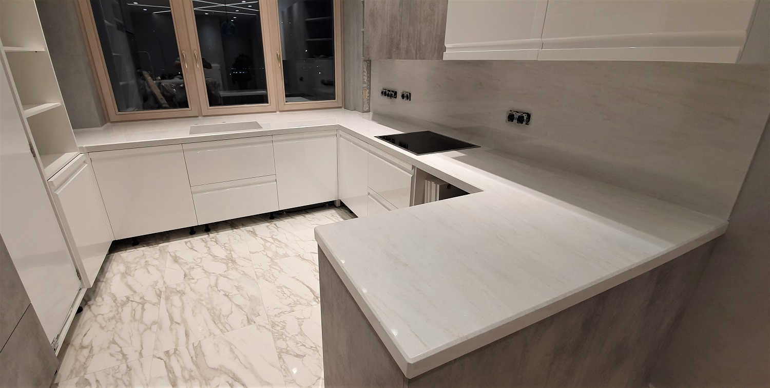 В кухню, совмещенную с гостиной, была спроектирована и установлена цельная столешница из искусственного камня с интегрированной мойкой. Во-первых, большие рабочие зоны по каждой стороне столешницы. Во-вторых, интегрированная большая мойка 560 × 400 с измельчителем напротив окна, а столешница в этой части глубиной 900 мм. Можно разбежаться хорошо в процессе готовки и сразу делать несколько блюд одновременно: салат, первое и второе! В-третьих, по стороне варочной поверхности установлена стеновая панель из искусственного камня. За ней легко ухаживать, мыть и чистить от жировых смесей, брызг. В-четвертых. Большая барная стойка в длину 1400мм. Подходит как для вечерних бесед, утреннего кофе-брейка или быстрого перекуса для трех-четырех человек. Также были сделаны вентиляционные отверстия в столешнице и скрытый люк для батареи. Люк нужен для стравливания воздуха из системы. Кромка столешницы из камня имеет скос на 45 градусов, который повторяет скос скрытой ручки фасада. Толщина столешницы 50мм придает массивный и тяжелый вид мраморной плиты. Архитектор продумал функциональность всех шкафов кухни, а команда мебельщиков предоставила качественные материалы и великолепную сборку. Цвет Tristone V-008 из серии мрамора добавил так же интересные линии и интеллигентности в помещении. Цена столешницы из искусственного камня с мойкой будет зависеть от размеров, а также вида и цвета искусственного камня.