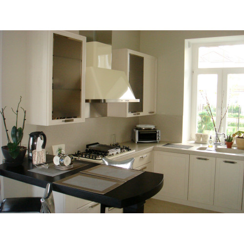 Интересный рисунок камня Sweet Peanut F- 303 имеет коричневые крупицы, очень похожие на рассыпанную гречку, которые придали слега темно-коричневый оттенок всей кухне. Данная столешница из искусственного камня имеет П-образную форму. И так как газовая варочная поверхность толщиной достигает более 6 см., чтобы избежать подреза шкафов кухни, использовалась толщина столешницы 6 см. Так же необходимо делать вентиляционные окна в подложке фанеры, когда устанавливается индукционная или газовая варочная поверхность. Они обеспечивают необходимую вентиляцию в монтажном пространстве техники, обеспечивая правильную и бесперебойную работу варочной поверхности. Переход столешницы из искусственного камня в подоконник окна увеличивает рабочую зону. На данном объекте в подоконнике был сделан вырез под обогреватель, зазор между камнем и габаритами обогревателя сделан минимальный - 1,5 миллиметра. Фартук из искусственного камня по трем стенам и вырезами под розетки придает целостность конструкции между плоскостями. Такой эффект невозможен при использовании плитки на стене, которая добавляет дополнительные цвета и оттенки в кухне. Две мойки имеют размеры 400 × 400 × 200 и 160 × 300 × 200. Маленькую чашку можно использовать для измельчителя пищевых отходов in sink erator evolution 200 за 14000 рублей или других производителей. В столешнице необходимо сделать отверстие для кнопки измельчителя пищевых отходов. Полировка - полуглянец.