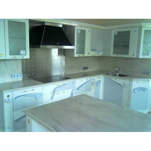 толщина столешницы 40 мм. кромка - R = 6 мм.мойка из нержавейки Blanco - монтаж подстольный вырез под варочную поверхность Kuppersbusch с термоизоляцией полировка искусственной столешницы полуглянец Камень Corian Glam Shell имеет тигриные полосы черного цвета на бежевом фоне, создавая эффект структуры мрамора с интересным рисунком. Оставляя все преимущества искусственного камня, по сравнению с натуральным, который представляет собой пористый материал и впитывает жидкости, как губка.