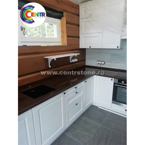 Столешница в дом из сруба была выбрана под дерево. Mahogany Nuwood - это цвет новинка 2019 года в серии мрамора Corian. Совершенно новый и ни на что не похожий цвет, имитирует дерево с естественной структурой древесного волокна. Так приятно было работать с данной фактурой – компания Центр Камня постаралась подобрать совпадение рисунка на кромке и на бортике. Полировка глянец специальной пастой для акрилового камня Corian. Мойка подстольного монтажа производителя Blanco (Бланко).В большом размере столешница максимально раскрывает свой цвет и фактуру. Так и хочется лишний раз прикоснуться и почувствовать волокна дерева, но это камень – долговечный, твердый и удивительно стильный. Идеальное решение для дачи, коттеджей и бань – столешница под дерево из камня!