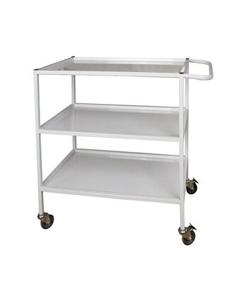 Столик процедурно-манипуляционный СПМР-2 - это передвижная медицинская мебель, предназначенная для размещения, хранения и транспортировки инструментов, медикаментов, перевязочных материалов и приборов в процедурных, перевязочных и операционных кабинетах. Столик выполнен из металлического каркаса на колесных опорах (передвижной) с металлическими полками 3-х ярусный с ручкой. Каркас стола изготовлен из профильной стальной трубы - 20*20*1,5 см. Столик имеет три металлические полки, изготовленные из листа холоднокатанного - 08ПС 1,5 мм, ручку и установлен на четыре импортные колесные опоры, диаметром 75 мм, две из них имеют тормоза. Поверхность столика имеет полимерное покрытие белого цвета. Габаритные размеры - 900*470*860 мм. Масса - 20 кг. Допустимая нагрузка на полку составляет - не более 15 кг.