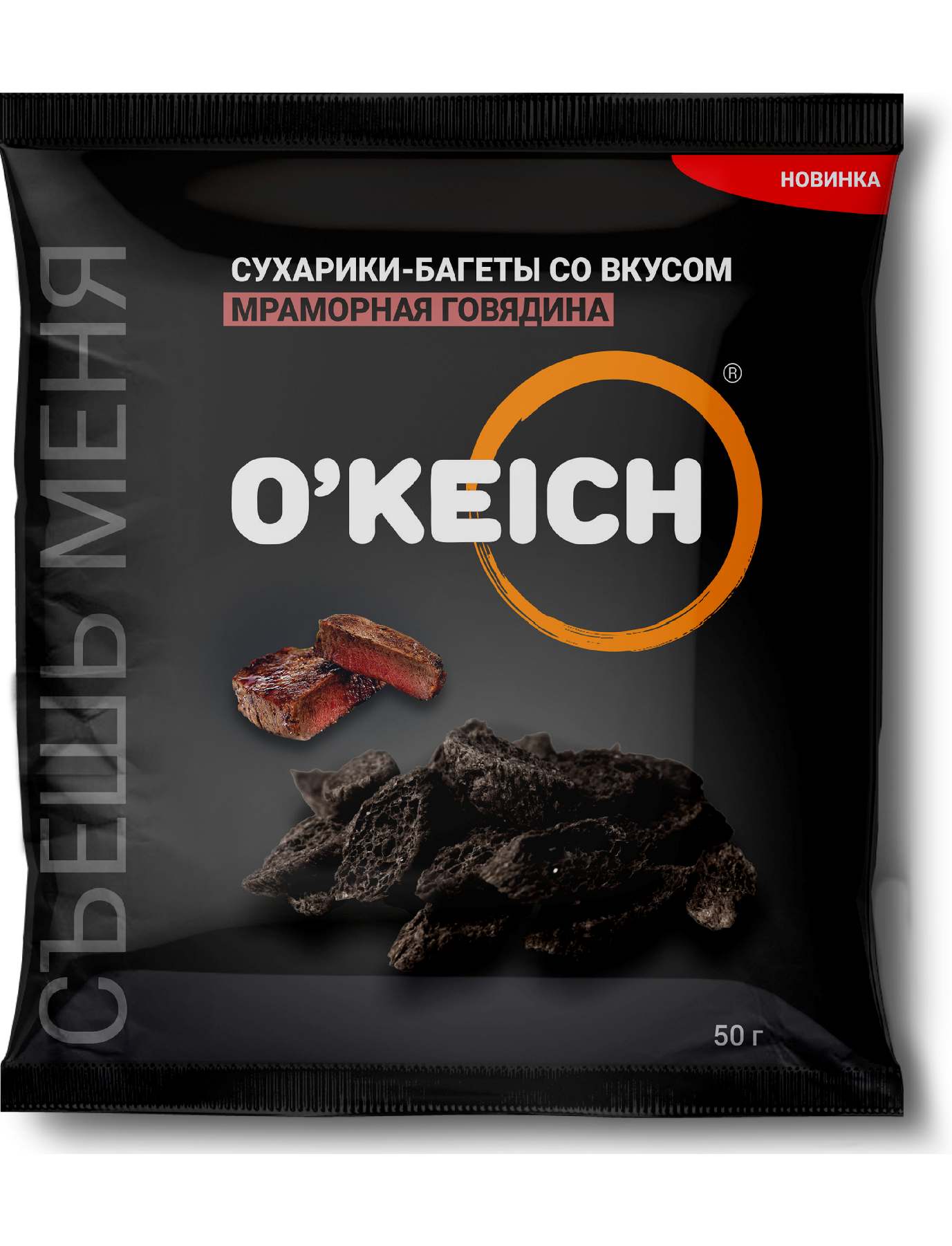 Сухарики-багеты ржано-пшеничные O'KEICH со вкусом Мраморная говядина – сухарики в виде хрустящих ломтиков багета с нежный вкусом отборной мраморной говядины.