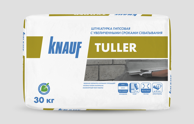 Сухая штукатурная смесь КНАУФ-Туллер на основе гипса с полимерными добавками, обеспечивающими удлиненные сроки схватывания. Предназначена для высококачественного выравнивания стен.Сухая гипсовая смесь КНАУФ-Туллер предназначена для высококачественного оштукатуривания вручную стен внутри помещений с нормальной влажностью, а также в кухнях и ванных комнатах (с покрытием, обеспечивающим защиту от увлажнения). Наносится на обычные твердые основания (кладку из кирпича — керамического, силикатного, пустотелого и т. д., бетон, гипсовые и бетонные блоки, старые цементные и гипсовые штукатурки, газобетон и пенобетон), а также на сложные основания (ЦСП, ПГП, ГКЛ (ГСП), щепоцементные плиты и блоки). При соблюдении технологии работ позволяет достичь категории качества поверхности Q3 (К3).